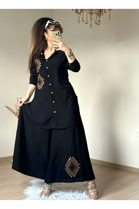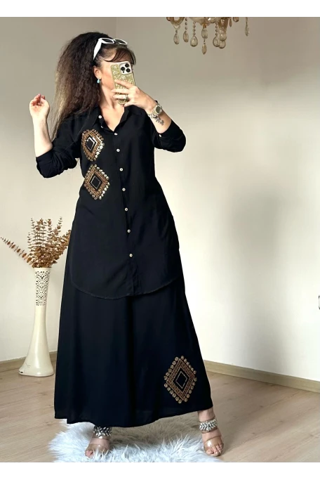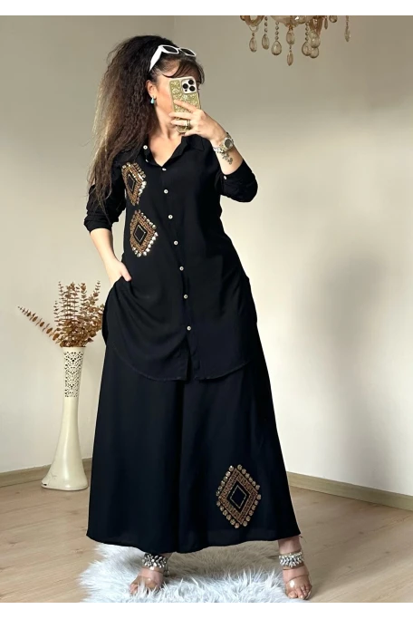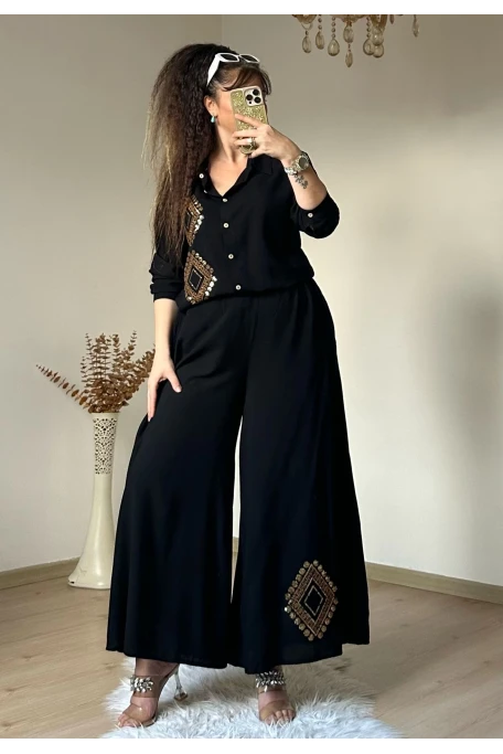 Yaka Taşlı Paça Detaylı Takım Siyah