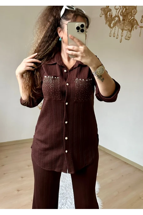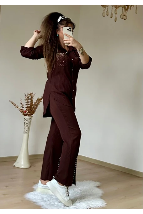 Yaka Taşlı Paça Detaylı Takım Kahve