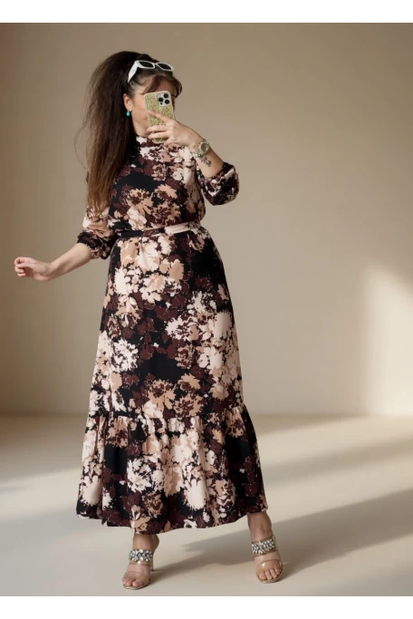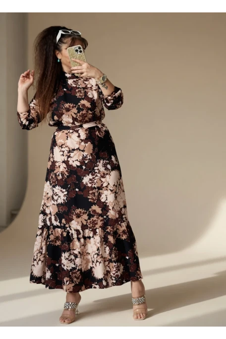 Balıkçı Yaka Kahve Çıceklı Elbise