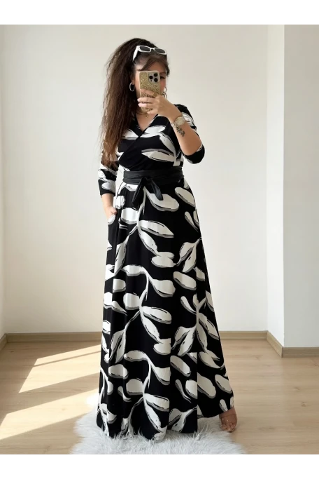 Tam Boy Beyaz Yaprak Desen Elbise