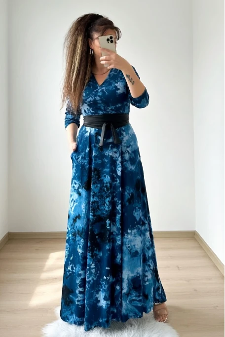 Halter Yaka Eteği Volanlı Krep Uzun Elbise Saks mavi
