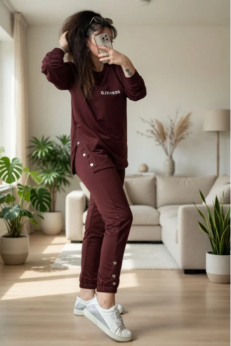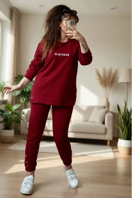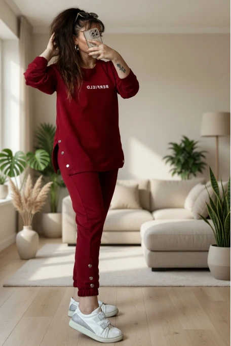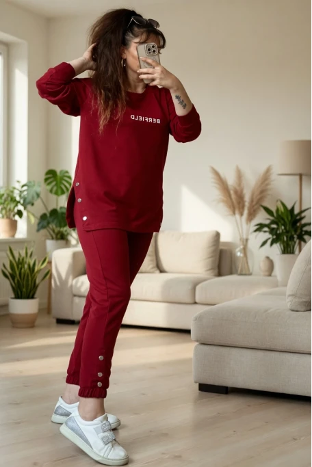 Uzun Kol Yan Çıtçıtlı Bordo Takım