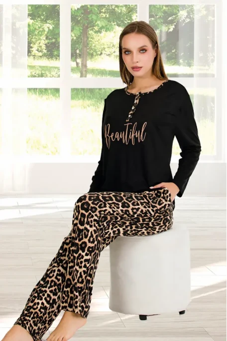 Uzun Kol Yaka Düğmeli Leopar Bayan Pijama Takımı