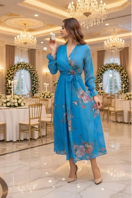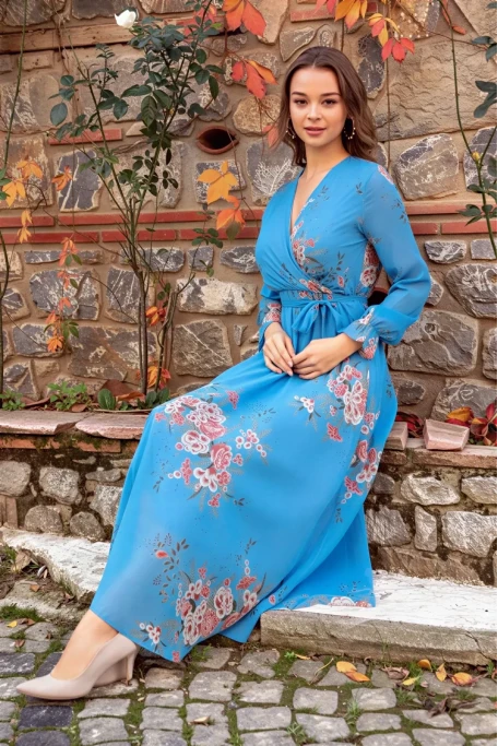 İnce Kuşak Mavi Çiçekli Uzun Şifon ElbiseÜrünün uzunluğu 140 cm'dir. (1-3 cm arası değişiklik gösterebilir.)Ürünün kol uzunluğu 60 cm'dir. (1-3 cm arası değişiklik gösterebilir.)Modelin üzerindeki ürün S /36 bedendir.Modelin Ölçüleri: Boy: 1.65, Kilo: 53,Kumaş Türü: ŞifonÜrün astarlı ve kemerli olarak tasarlanmıştır.geniş kalıptır